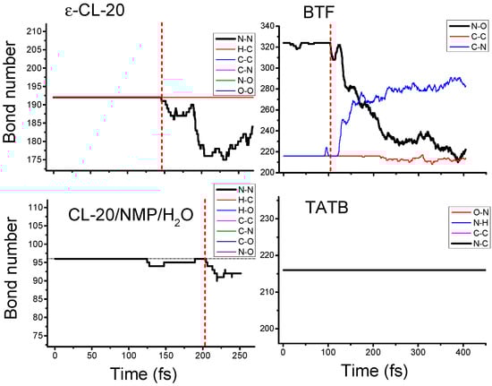 Bond number vs time plots for the shocked ε-CL-20 crystal, BTF crystal, CL-20/NMP/H2O cocrystal and TATB crystal. The chemical bonds counted included N–N, H–C, H–N, H–O, C–C, C–N, C–O, N–O and O–O bonds. The sign of the initiation of the reaction under shock was a continuous reduction in the number of trigger bonds.