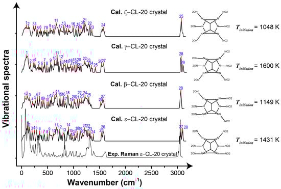 The shock can be simplified into a perfect impulse f(t), which has an infinitely small duration. Its Fourier transform implies that the shock causes a constant amplitude response in the entire frequency domain. Therefore, the more characteristic peaks in the vibrational spectra of an energetic crystal, the more modes can be excited and the more heat can be generated under the same shock condition. We plotted the vibrational spectra for the ε, β, γ and ζ polymorphs of CL-20 crystals in Figure 5. The number of characteristic peaks of the vibrational spectra of ζ-CL-20 was 25, which was the least among the four polymorphs. Correspondingly, the generated temperature Tinitiation = 1048 K was also the lowest. On the other hand, that peak number was the most for γ-CL-20 (29) and consistent with this, the temperature of Tinitiation = 1600 K was the highest. For the other two polymorphs, both the peak number and the temperature fall in the middle.