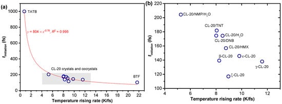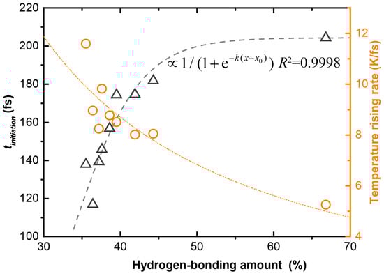 The intermolecular hydrogen bond A:H–D (with “:” representing the electron lone pair, A for acceptor and D for donor) integrates the H–D polar-covalent bond, the A:H nonbond, and the A–D repulsive coupling interaction. Under shock, the hydrogen bonds show their elasticity—the covalent bond segment contracts and the nonbond elongates [,]. The special elasticity allows hydrogen bonds to vibrate in a continuous frequency region (<200 cm−1) so that the crystal can absorb more energy from the shock before reaching a temperature that is too high. This is analogous to the function of hydrogen bonds on improving the specific heat capacity of liquid H2O []. In order to confirm our hypothesis, we show the relationship between the TRR and the hydrogen bonding amount in Figure 7, which is roughly a power function. This relationship suggests that the hydrogen bonding has a buffering effect on the heating of the system under shock, thereby delaying the initiation time of the chemical reaction tinitiation. This is the fundamental reason why cocrystallization with low-sensitive EM components can effectively reduce the sensitivity of CL-20 crystals.