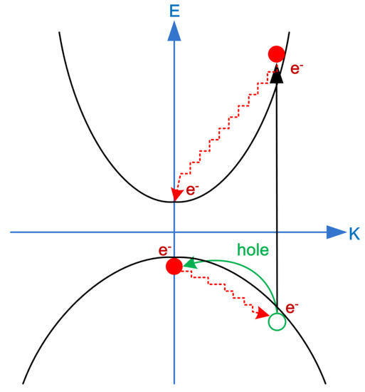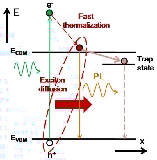 Photon energy can be efficiently converted to electrical power by using p-type materials due to the high absorption coefficient. Figure 1 shows the carrier dynamics of photo-excited electrons in an energy–space diagram. When the incident photons are absorbed by a p-type material, the electrons in the ground state can transit to the excited state to form hot carriers. The hot carriers can be viewed as the oscillating charged particles, which can coherently and incoherently collide with the lattice vibrations (photons). The coherent collisions between the hot carriers and phonons can result in Raman scattering emissions. The incoherent collisions between the hot carriers and photons can result in the photoluminescence (PL) emissions. In addition, the hot-carrier mediated PL emissions can be observed in the perovskite thin film due to the slow thermalization process [41].