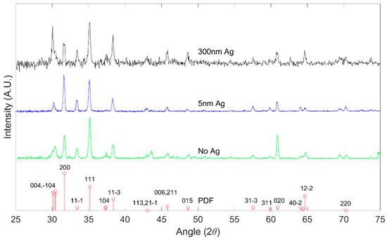 X-ray diffraction (XRD) pattern of β-Ga2O3 for different Ag thickness at 1000 °C, indexed in comparison to PDF 00-041-1103.