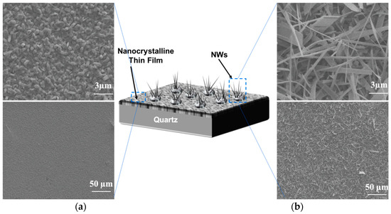 Scanning electron microscopy (SEM) images of 5 nm Ag-coated and uncoated areas acquired in the regions indicated in the illustration (middle). (a) Thin film. (b) nanowires.