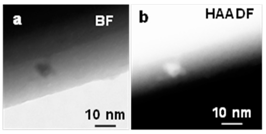 (a) Bright field (BF) (b) high-angle annular dark-field (HAADF) STEM images of Ag NPs at the interface of Ga2O3 nanowire growth on quartz substrate at 1000 °C. The NP was bright due to z-contrast.