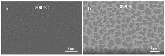 Obviously, the growth kinetics are highly influenced by the thickness of the Ag thin film and high oxidation temperatures. When Ag thin film was 5 nm, silver film dewets and forms nanoparticle-like structures [34]. It has been shown that 5 nm and 10 nm Ag thin film dewets very fast at a temperature below 400 °C [34], leading to a fast conversion of Ag thin film to NPs. Consequently, this process could be more beneficial to form nanowires directly on the quartz substrate. However, as the thickness of Ag thin film increases (300 nm), the film requires a higher temperature (i.e., T > 800 °C) to shrink and form nanoparticles that enhance the growth of Ga2O3 as shown in Figure 8. The formation of nanoparticle is more sluggish with thicker Ag films, as more time and temperature are required to complete the dewetting of the film. At a constant temperature (1000 °C), the formation of a thicker nanocrystalline layer of Ga2O3 was increased at a shorter time and thinner and denser nanowires at a longer time.