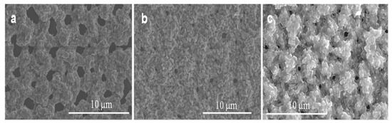 The effect of oxygen flow rates on Ga2O3 growth at a constant annealing temperature (1000 °C) and time (10 min) has been investigated. Figure 10 shows SEM images of nanocrystalline Ga2O3 growth on quartz coated with 300 nm Ag thin film at 1000 °C and various oxygen concentrations and time. Obviously, the nucleation of nanocrystalline Ga2O3 was increased as the oxygen concentration increased form 0.088 mL/min to 0.28 mL/min at constant time, leading to thicker coating of nanocrystalline Ga2O3 on quartz substrate (Figure 10a,b). The growth of Ga2O3 was accomplished under a very low oxygen flow rate. Then the number density became much higher when the flow rate increased to 0.16 mL/min. However, after additionally increasing the flow rate to 0.28 mL/min, the nanocrystalline growth was increased and the film was still showing large crystallites. As the oxygen concentration and time increased from 0.088 mL/min to 0.28 mL/min, the accumulation of grown nanocrystalline Ga2O3 was slightly controlled, forming improved coating and growth of Ga2O3 on the surface of the quartz (Figure 10a,c). From these results, it could be expected that Ga2O3 requires more time to complete the growth from a nanocrystalline film in a short time (Figure 11) and that the nanowire nucleation will take longer (Figure 9b). Alternatively, these results may suggest that the nanowire growth observed at 300 nm silver films self-nucleates on the crystallites formed from a thick Ag film.