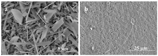 SEM images of Ga2O3 obtained at 1000 °C for 5 min. (a) Denser growth of nanowires using 5 nm Ag. (b) Nanocrystalline grains growth using 300 nm Ag.