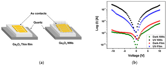 (a) Schematic of Au/β-Ga2O3/Au metal-semiconductor-metal (MSM) photoconductor of β-Ga2O3 thin film (left) and nanowires (right) on quartz. (b) Semi-logarithmic plot of current-voltage for Au/β-Ga2O3/Au MSM, including β-Ga2O3 thin film and nanowires, versus applied voltage characteristics at 10 V without and with UV illumination at 10 V.