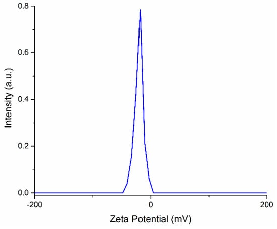 One estimation of stability of MgHAp nanoparticles suspension was realized by ζ-potential measurements. The ζ-potential distribution obtained for 10MgHAp nanoparticles suspension is presented in Figure 2. The measured ζ-potential value for MgHAp nanoparticles in water was −17.77 ± 3.4 mV. The “low” value of the ζ-potential indicates that the suspension is unstable. According to previous studies [45,46,47], the colloids with low ζ-potential tend to flocculate, and indicate an incipient instability.