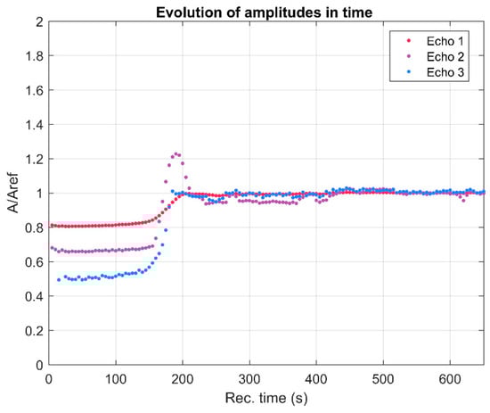 Recorded signals at 5 s recording interval. The increasing amplitudes of the first echo is visible in colors, whereas the second and third echo are significantly weaker (in black).