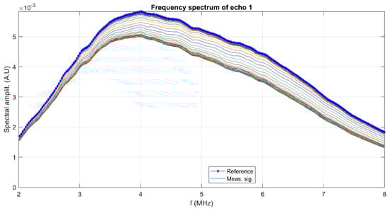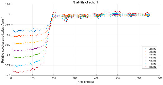 The stability assessment of 10MgHAp suspensions by ultrasound measurements was performed taking into account the most important parameters involved in determining the degree of stability, such as the ultrasonic velocity in the sample, the maximum amplitudes of the signals transmitted at the recording moments, and the frequency spectrum of the first transmitted echo. The most eloquent parameter with respect to the assessment of the stability of the nanoparticles suspension of 10MgHAp is the spectral amplitudes variation during the experiment. For a conclusive evaluation, the results obtained on 10MgHAp suspensions were compared with those obtained for water (which is a stable fluid) under the same experimental conditions. Time delays between the first three recorded echoes and those of the reference allow an accurate determination of the velocity of ultrasounds in the sample, for each recorded signal. The result is c = 1503.91 m/s, compared to the velocity in the reference fluid c0 = 1503.68 m/s at 27 °C. Because this velocity has a very small variation during the particle sedimentation it cannot be used to characterize the sample evolution in time. The maximums in transmitted signals amplitudes vs. recording moments (Figure 3) represent a significant variation. It has been observed that there is a slow variation for t < 150 s, during the sedimentation period, variation that will be used for further processing. The slow variation for t < 150 s was followed by a rapid variation of these amplitudes as the apparent surface of sedimentation passes in front of the coaxial transducers. After this passage, follows another a sedimentation period of scattered nanoparticles, in which the echoes amplitudes tend to those in the reference fluid. Since the second and third echoes are affected by ultrasound scattering, especially in the rapid transition period (150–210 s), producing even higher amplitudes than in the reference fluid (Aref), we decided to use only the first echo in the following analysis (Echo 1 in Figure 3).