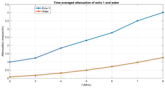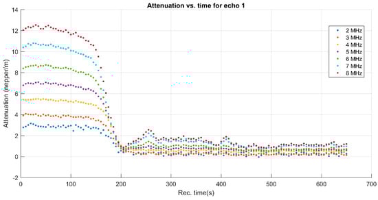 A more explicit information on the attenuation dependency of frequency (in blue) is given in Figure 6, compared to the same dependency on frequency for the reference fluid (in red). The attenuation is considerably higher (1–4 nepper/m) for the sample compared to 0.3–1.3 nepper/m for the reference fluid. Certainly, the attenuation for each spectral component depends on the moment during the experiment, as shown on Figure 6. During the initial stage, an attenuation of 12 nepper/m for the 8 MHz component in the recorded Echo 1 is a characteristic of this sample, as shown in Figure 5. The lowest attenuation of 3 nepper/m is obtained for the 2 MHz spectral component. During the asymptotic sedimentation period (after 200 s in this case), the attenuation coefficients tend towards stable values, which correspond to those in the reference fluid. As a partial conclusion, the first transmitted echo, recorded during the recording interval 100–150 s provides sufficient information for a complete characterization from the ultrasonic point of view of this sample: stability, overall and spectral attenuation.