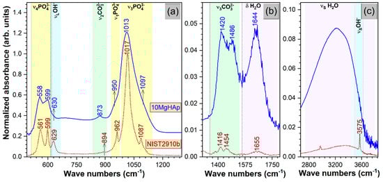 The comparative Fourier-transform infrared (FTIR) spectroscopy in attenuated total reflectance (ATR) mode spectra of the 10MgHAp and National Institute of Standards and Technology SRM2910-b samples in three relevant wave number regions: (a) 500–1300 cm−1; (b) 1300–1800 cm−1; and (c) 2700–3800 cm−1.
