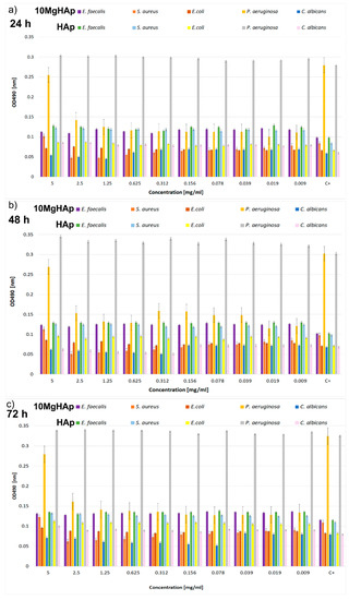 The dynamics of the antimicrobial activity of 10MgHAp and HAp against Enterococcus faecalis ATCC 29212, Staphylococcus aureus ATCC 25923, Escherichia coli ATCC 25922, Pseudomonas aeruginosa ATCC 27853, and Candida albicans ATCC 90029 microbial cells after (a) 24 h, (b) 48 h, and (c) 72 h of incubation.