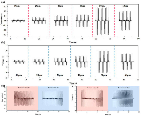 According to the above equation, the distance of two friction layers (spacer thickness) also affects the sensor’s output performance. To characterize the output of the sensor under different spacer thicknesses, a linear motor was used to provide quantitatively periodic external forces to apply to the sensor. The measurement (2611B) was used to precisely obtain the output voltage and output current. The sensor size was 2.0 × 1.8 cm2; the effective contact area was 1 × 1 cm2; and the applied periodic force was 10 N during the electrical test. Figure 2a,b respectively, present the short-circuit current (ISC) and the open-circuit voltage (VOC) performances of the sensor under different spacer thicknesses. Both ISC or VOC showed the tendency of first increasing and then decreasing, and the maximum output could be obtained under the 50 μm spacer thickness. However, according to the above formula, the output was proportional to the spacer thickness. The test results did not match the theory. This difference was due to the fact that sensor could not be equivalent to the parallel plate capacitor with the increase of spacer thickness [31]. That is to say that the edge effect of capacitance directly affected the sensor output performance. Hence, the thickness of spacer layer was selected as 50 μm to obtain the optimal output performance. Figure 2c,d present the ISC and VOC of the sensor with different connection modes (forward connection and reserve connection), which demonstrate that the output electric signals truly belonged to the device.