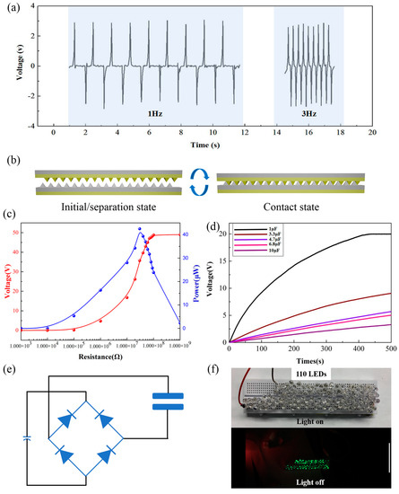 Considering its practical application, the sensor is supposed to be operated under different frequencies. Figure 3a presents the electrical output performances of the sensor at the operating frequencies from 1 to 3 Hz. The results show that the peak-to-peak value of the VOC was independent of the frequency. According to the previous research, the influencing factors of VOC are the amount of transfer charges and the capacitance between two electrodes at different spacer thicknesses [3,32]. Therefore, the VOC is irrelevant to the frequency (time). In order to evaluate the output power, the TENG usually connects with external loads from 1 KΩ to 1 GΩ in series as a power supply (the effective contact area was 4 × 4 cm2 in the test; as shown in Figure S3, the two triboelectric layers were separately fastened on the fixed end and active end; the schematic diagram of contact-separation mode is shown in Figure 3b). The output power can be calculated from VOC2/R, where R is the external load resistance. As shown in Figure 3c, the tendency of output power first increased and then decreased; the power could reach up to maximum when the external load resistance was about 30 MΩ. Capacitors are a common energy storage unit which can store the power energy generated from the developed TENG. The charging curves (Figure 3d) show the time required for the developed TENG to charge different capacitors via a bridge rectifier circuit. The schematic diagram of the bridge rectifier circuit is shown in Figure 3e. The alternating electricity could charge a 1 μF capacitor to ~20 V in seven min with the continuous contact-separation process. The charging time increased as the value of the capacitor increased. Then, the stored energy in capacitor could further support the power for the commercial equipment (calculator, hygrothermograph, electronic watches and so on). Furthermore, as a force–electricity conversion device, we utilized 110 green LEDs that connected in series as an external load to validate the feasibility of the developed TENG as a power source. As shown in Figure 3f and Video S1, the 110 LEDs could be directly lit up when the TENG performed the continuous contact-separation process.