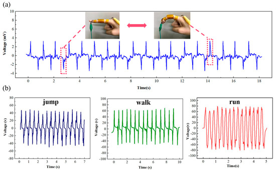 Due to its excellent electric performance (high output, high sensitivity and good linearity), high flexibility and good stability, the developed TENG-based sensor can be easily attached to the human joint or cloth, and it can used for various mechanical energy harvests and human body movement detections. As shown in Figure 5a, the TENG-based sensor can be fixed to the finger by 3M tape to monitor bending status in real time. The voltage can reach up to ±4V, and the positive voltage and negative voltage correspond with the bending status and release status, respectively. Furthermore, the sensor can not only monitor finger movement but also detect different motion states. For instance, the developed sensor can be attached on the knee to detect different motion states. The bending of knee brings the contact and separation of the two triboelectric layers; the different motion states lead to the different peak-to-peak values and frequencies of the obtained signals. Hence, as shown in Figure 5b and Videos S2 and S3, the peak-to-peak values of the obtained signals were as follows: Jump < walk < run; the frequencies were follows: Walk < jump < run. Hence, we can obtain the detailed movements information from the shapes and frequencies of the obtained signals. Consequently, the above results demonstrate the promising application of the flexible and self-powered TENG-based sensor in harvesting human mechanical energy and detecting human motion.