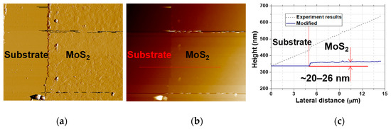In our experiment, we employed an atomic force microscope (AFM, Bruker Multimode 8, Bruker, Karlsruhe, Germany), and layered properties of the MoS2 deposited on sapphire substrate were also tested for better understanding the layer-dependent nonlinear absorption properties such as modulation depth, saturable intensity, and so on. Figure 3a,b show the recorded AFM images of the MoS2; a large-area MoS2 film with flat surface was fabricated successfully. Figure 3c shows the corresponding thicknesses of the marked areas of Figure 3b. Firstly, the measured results proved that the substrate exhibited an obvious inclination angle, thus the measured results were modified by reducing the effect of the slope efficiency; also shown in Figure 3c. As is shown, the thicknesses of the marked area are about 20–26 nm, corresponding to the number of layers of about 30–40 [34]. The overall results reveal that MoS2 materials with a smooth surface and uniform layer numbers were fabricated successfully. Besides, as depicted in Figure 1, the MoS2 film with thickness around 20 nm appears to be non-continuous; however, because of the limitation of the used resolution of the AFM, the characteristics of the non-continuous surface were not investigated. In our future work, however, we will try to study the non-continuous characteristics of the MoS2 and its potential influence on the properties of the SA.