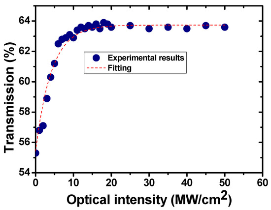 The nonlinear optical properties of the prepared MoS2 SA were tested based on a well-known two-arm detection method [31,32,33]. In our work, a home-made Yb-doped mode-locked fiber laser operating at the central wavelength of 1060.36 nm with a 3 dB spectral width of 1.63 nm, a pulse width of 12.6 ps, a maximum average output power of 30 mW, and a pulse repetition rate of 13 MHz was employed as the pump source for the testing. The measured results are provided in Figure 4. For a traditional 2D material, its nonlinear optical properties, including the saturation intensity, modulation depth, and so on, could be calculated by fitting the measured results based on the widely-used formula [31,32,33]: