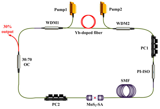 The experimental setup for the generations of Raman solitons is shown in Figure 5. As is depicted, a double-end-pumped ring laser cavity is designed. Two 976 nm laser diodes (LDs) with a maximum average output power of 900 mW are used as pump sources for providing enough energy for the Raman conversion, which are guided into the laser cavity through two 980/1030 wavelength division multiplexers (WDM1 and WDM2). A piece of ~0.9 m long Yb-doped fiber (Nufern, LMA-YSF-10/125, Connecticut, USA) is used as the laser gain medium. A polarization independent isolator (PI-ISO) and two polarization controllers (PC1 and PC2) are used to guarantee the unidirectional transmission and adjust the polarization states in the laser cavity. The SA is set between the PC2 and PI-ISO. The output fiber laser is output from the 30% port of a 30:70 output coupler (OC). Additionally, a piece of ~290 m SMF is added into the ring laser cavity for enhancing the Raman gain coefficient. Finally, the total cavity and the overall length of the passive fiber is about ~300.63 m.