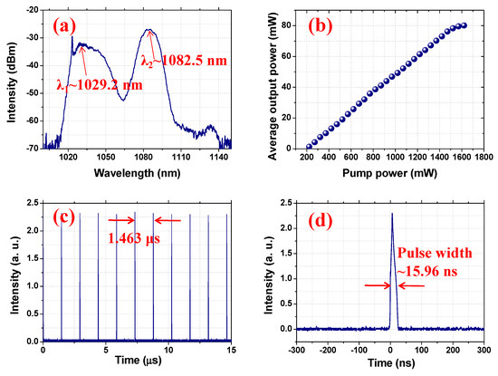 Meanwhile, when the pump power is higher than 630 mW, the adjustment of the state of PCs also leads to the formation of dual-pulse Raman soliton. The recorded output performances under the available maximum pump power of 1730 mW are shown in Figure 9. Figure 9a shows the emission spectrum, which exhibits two obvious peaks corresponding to the first Stokes Raman and the fundamental wavelength. The central wavelengths of the fundamental and first Stokes Raman laser are 1032.1 and 1081.85 nm, respectively. The characteristics of the average output power are shown in Figure 9b; the maximum average output power is 89.33 mW under the pump power of 1730 mW. However, no saturated tendency is recorded with the increase of the pump power, indicating that higher average output power can be expected under high pump power, which is different from the mentioned single-pulse operation. However, because of the limitation of the available maximum pump power, the output performance under higher pump powers is not investigated. The recorded pulse train and typical pulse shape are depicted in Figure 9c,d; the pulse repetition rate was also 683.5 kHz, corresponding to a pulse energy of as high as 130.7 nJ. However, as shown in Figure 9d, the pulse shape splits into two pulses, and the corresponding pulse widths are 6.93 and 5.57 ns. Additionally, as it is mentioned that a 30:70 OC is used for outputting the pulse energy through its 30% port, the corresponding pulse energy within the laser cavity is calculated to be about 305 nJ, indicating that the damage threshold of the SA is higher than 0.48 J/cm2, which exhibits significant enhancement.