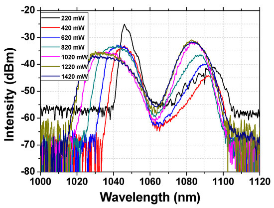 The spectral evolution of the dual-pulse Raman soliton operation was also recorded and is shown in Figure 11. As in the single-pulse case, with the increasing of the pump power, the intensity of Raman solitons increases gradually. Meanwhile, the intensity of the fundamental frequency light gradually decreases as a result of the energy transfer. Finally, the intensity of the Raman soliton exceeds that of the fundamental frequency. The evolution of the spectrum also fully shows the formation and enhancement of Raman solitons.