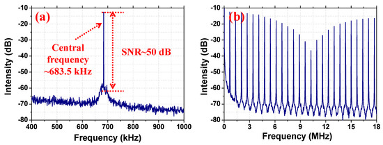 The operation frequency information of the dual-pulse mode-locked Raman soliton operation. (a) Recorded within 600 kHz bandwidth. (b) Recorded within 18 MHz bandwidth.