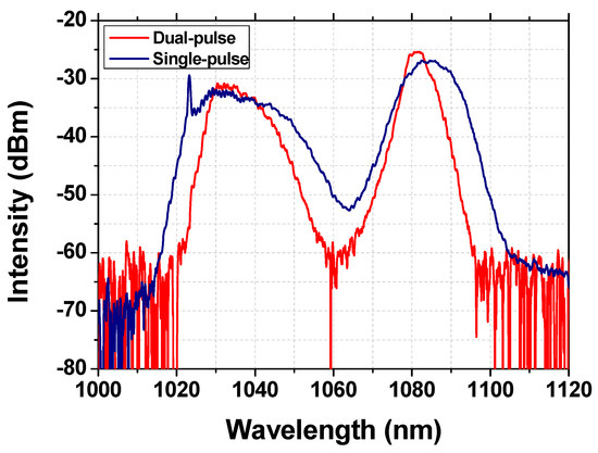 For understanding the differences between the pulse shapes of the two mentioned kinds of Raman solitons, the comparison of the corresponding emission spectra under the maximum pump power is depicted in Figure 12. As is shown, for the single pulse Raman soliton, the emission spectrum exhibits a wider 3 dB spectrum width for both the fundamental and first Stokes wavelengths. However, the emission spectrum of the dual-pulse Raman soliton exhibits relatively more independent emission peaks, which will lead to a dual-pulse operation.