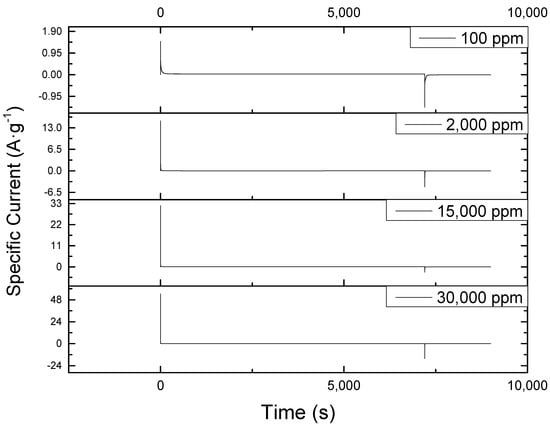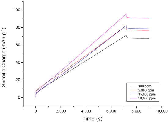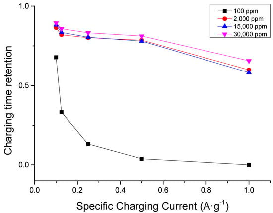 As illustrated in the chronocoulometric plot of operation at different concentrations found in Figure 4, charging time retention is decreased for all concentrations when specific charging current is increased. Moreover, the decrease in retention is less pronounced when the concentration is higher. This implies that a higher concentration either helps preserve electrode quality or gives a higher ion availability of for electrosorption. The latter seems more logical because the order of cycle begins with the fastest charging current (1 A·g−1) and ends with the slowest charging current (0.1 A·g−1).