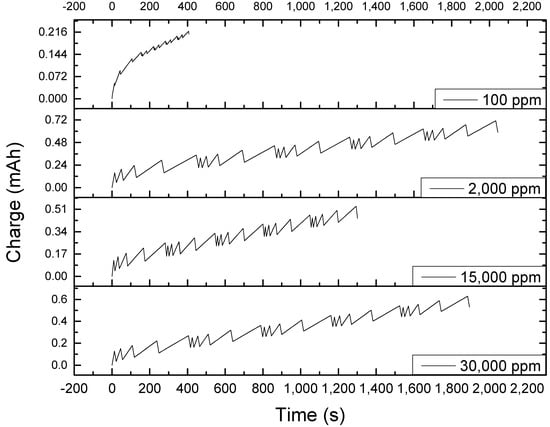 A deeper understanding of the behavior recently discussed could be provided by the operation’s chronocoulometric or charge plot. The chronocoulometric plot in Figure 5 shows the recurrence of a pattern every five peaks, with each peak having a wider base as the cycle progresses. Theoretically, it is expected that each charge-discharge start and end at complete discharge. However, it was discovered from the chronocoulometric plot that discharge was not complete. This caused the lowering of charging time as the cycle progressed but, compared to the discharge inefficiency observed with zero-voltage desorption, the performance of this operation was much better. Moreover, this plot shows that the charging time was significantly shorter for low sodium chloride concentration. These observations illustrate that the low retention obtained at repeated charge-discharge does not necessarily mean that the electrodes degenerate. Rather, the apparent decrease in its usability is due to the ions that fail to be discharged completely. This can be solved by changing the operational conditions of the system. Rather than controlling the voltage, the charge should be controlled instead. However, this may lead to a voltage greater than 1.2 V at discharge, something that should be avoided because beyond this voltage, electrolysis of water and oxidation of titanium plates can happen. Thus, a more viable solution would be to use a slower charging current when performing repeated cycles.