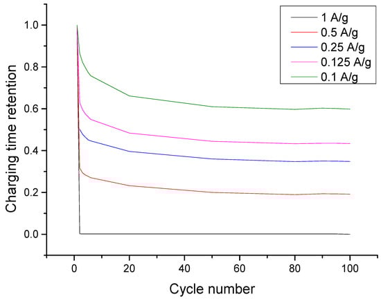 Charge time (capacity) conservation plot at different charging currents showing that retention increases with specific current. All plots approach a lower limit of charging time retention with increasing number of cycles, implying that the electrode can be recycled for at least 100 cycles.