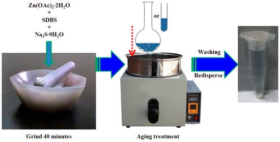 The Q-ZnS was synthesized in accordance with the procedure illustrated in references [11,12,13,14,15] and following the subsequent aging treatment. Figure 1 illustrates the manipulation for the synthesis of Q-ZnS. Firstly, Zinc acetate dihydrate (Zn(OAc)2·2H2O) powders were blended with surfactants SDBS at a molar ratio of 5:1 (Zn(OAc)2·2H2O/additive) and ground together for 10 min at room temperature (Grinding operation: holding the handle of the pestle and pressing on the reagent in the pestle to rotate at about 60–80 revolutions per minute (rpm)). Then, the sodium sulfide hydrate (Na2S·9H2O) was added with a molar ratio of 1:1 between Zn(OAc)2·2H2O and Na2S·9H2O. The mixture was ground for about 30 min to obtain a masterbatch. In the subsequent process, the masterbatch was collected into a vessel and preserved with oil baths at different temperatures (50 °C, 100 °C, and 150 °C, respectively) for 12 h. Finally, the aged masterbatch was centrifugation washed with deionized water (three times) and absolute ethanol (one time) respectively, and dried at 60 °C to obtain the desired product. According to the aging temperature, the samples were named Q-ZnS-I, Q-ZnS-I′, and Q-ZnS-I″, respectively (Q-ZnS-I: 50 °C, Q-ZnS-I′: 100 °C, Q-ZnS-I″: 150 °C). Several batches of ZnS quantum dots with different particle size distributions will be obtained by adjusting the rotational speed of centrifuge (3000 and 4000 rpm, respectively) from the Q-ZnS-I′. Herein, the redispersed sample, Q-ZnS-I′, was centrifuged at 3000 and 4000 rpm respectively, and supernatant and precipitation were separated. The supernatants were labeled Q-ZnS-I′-i and Q-ZnS-I′-ii, respectively.