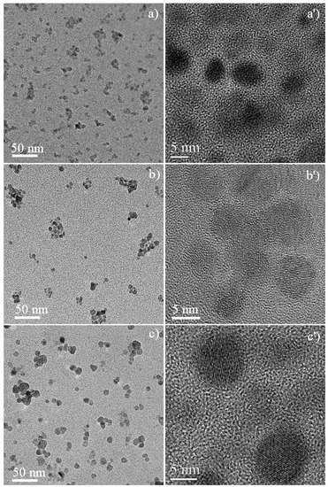 TEM and HRTEM images of representative nanocrystals of samples: a,a′) Q-ZnS-I; b,b′) Q-ZnS-I′; c,c′) Q-ZnS-I″, respectively.