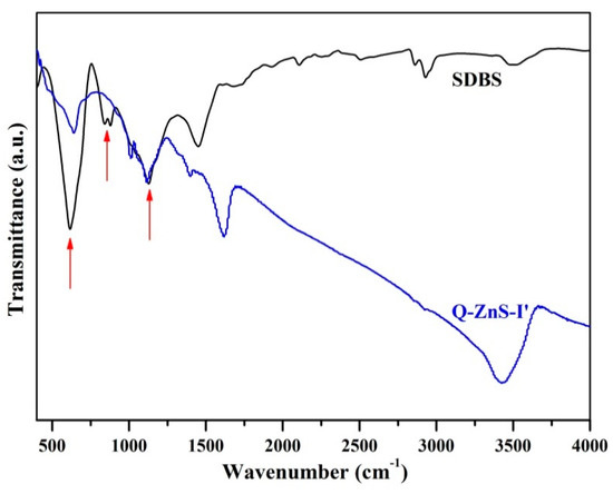 FT-IR spectra of SDBS and Q-ZnS-I′.
