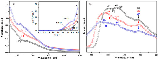 a) Comparison of Ultraviolet-Visible (UV-Vis) and b) Photoluminescence (PL) spectra of three samples: Q-ZnS-I (blue symbol scatter), Q-ZnS-I′ (red symbol scatter), and Q-ZnS-I″ (black symbol scatter). The inset is the plots of (αhν)2 versus (hν) for three samples: Q-ZnS-I (blue), Q-ZnS-I′ (red), and Q-ZnS-I″ (black). The band gap values were estimated to be 4.85, 4.76, and 4.58 eV for Q-ZnS-I, Q-ZnS-I′, and Q-ZnS-I″, respectively.