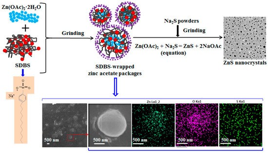 Proposed formation mechanism of ZnS nanocrystals through sodium dodecyl benzene sulfonate (SDBS)-wrapped zinc acetate packages in the room-temperature mechanochemical route. Bottom: SEM and EDS-mapping characterizations for the SDBS-wrapped zinc acetate solid-state vesicle.