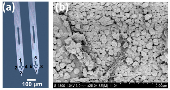Characterization of the microelectrode array (MEA) structure. (a) The electrodes are distributed on the tips with dopamine (DA)-sensitive electrodes (S1, S5) and electrical electrodes (S2–S4, S6–S8). (b) The SEM image of the Pt/rGO nanoparticles-modified electrode.