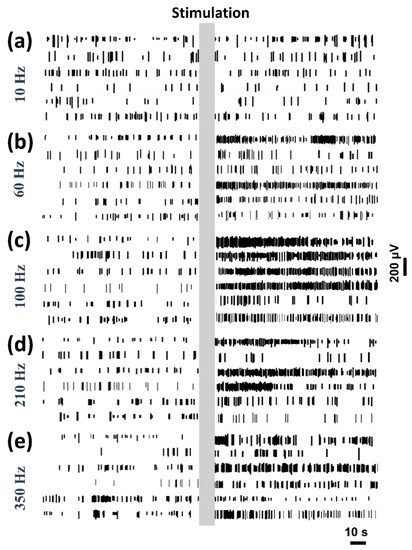 When the MEA was implanted into the striatum at the speed of 1 um/s, stable neural spike firing was recognized and recorded. The typical neural spike firing response of six channels is shown in Figure 3. The static neural firing was recorded for 5 min before stimulation. Then, five frequencies were applied in the STN, relatively. The interval between the two stimuli was five minutes, which is long enough for the effects of the previous stimulus to disappear. As can be seen, the low-frequency stimulation such as 10 Hz has no significant effects on neural spike firing (Figure 3a). At 60 Hz, neural spike firing is increased in two channels after stimulation, while the other channels show a small increase. At 100 Hz, note that neural spike firing is increased significantly. The neural spike fires intensively after stimulation. At 210 and 350 Hz, the increase in neural spike firing goes down. The high frequency of around 100 Hz of DBS plays a different role in modulating neural spike firing. Too high or too low frequency stimulation would induce less modulation on neural spike firing.