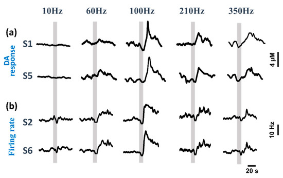 The neurotransmitter is released from the vesical to the synaptic cleft during stimulation. The neurotransmitter and neural spike discharge are the two main methods to communicate with each neuron. The DA variation (S1, S5) and the corresponding firing rate responses of two channels (S2, S6) were extracted as shown in Figure 4. The dual-mode signals of a 110 s time span including the before (50 s), during (10 s) and after (50 s) stimulation times were extracted to analyze the synchronous relevance of DA and the firing rate. The gray rectangle in each curve represents the duration of stimulation which lasted for 10 s. The relationship underlying DA concentration, firing rate and stimulation frequency was analyzed. Figure 4a shows the extracellular DA concentration variation (S1, S5) evoked by STN stimulation. Figure 4b shows the neural spike firing rate variation before and after stimulation. Note that different stimulation frequencies evoke different responses of DA and the neural spike firing rate in the striatum. They show a similar change trend as the frequency increases. The DA concentration and neural spike firing rate respond to the stimulation when the frequency is increased from 10 to 350 Hz. At 100 Hz, the release of the DA content and the firing rate are maximum. The low frequency (10 Hz) has no significant effects on the DA concentration and neural spike firing. As the frequency of the stimulation increases, the dual-mode signals are modulated significantly. While the stimulation is too high, for example, at 210 and 350 Hz, the DA concentration and neural spike firing still increase, but they are much less than their states during 100 Hz stimulation.