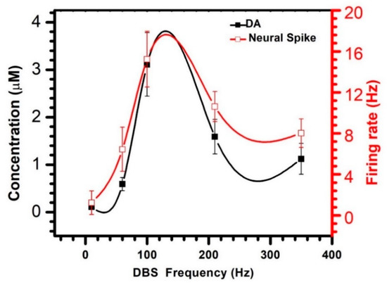 Figure 5 shows the mean variations of the DA concentration and neural spike firing rate under the different stimulation frequencies. Note that the DA concentration and neural spike firing rate show a similar change as the stimulation frequency changes. When the stimulation frequency increased from 10 to 100 Hz, the DA concentration and neural spike firing rate increased and reached the maximum value at 100 Hz. However, both signals decreased when the stimulation frequency increased from 100 to 350 Hz. When the stimulation frequency is too low (10 Hz) or too high (350 Hz), the variation of the dual-mode signals is less than the frequency at 100 Hz. There may be a subtle frequency around 100 Hz that could modulate the dual-mode signals at a higher value than those at 100 Hz. In combination with the clinical therapeutic effects achieved by 100 Hz stimulation, the modulation of dopamine and neural spike firing may be one way in which the stimulation works.