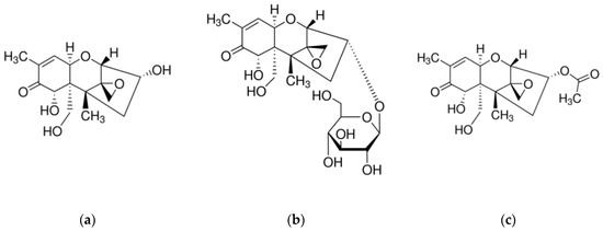 Chemical structures of (a) deoxynivalenol (DON); (b) DON-3-glucoside; and (c) 3-acetyl-DON.