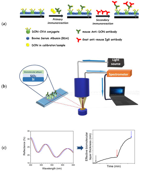 (a) Schematic of the immunoassay format and steps. (b) Schematic of the instrumentation employed for DON determination. (c) The transformation of spectral shifts due to primary (red line in the left graph) and the secondary immunoreaction (blue line in the left graph) with respect to baseline (black line in the left graph) to “effective biomolecular layer thickness” (the black, red and blue arrows in the right graphs correspond to baseline, end of primary immunoreaction, and end of secondary immunoreaction, respectively).