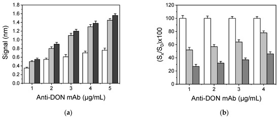 The DON assay developed on the WLRS biosensing platform is a competitive immunoassay performed in two steps. In the first step (primary immunoreaction), DON present in calibrators or samples competes with the DON immobilized onto the chip surface (in the form of DON-OVA conjugate) for coupling to the anti-DON mAb binding sites. Then, a secondary antibody (goat anti-mouse IgG antibody) is introduced which binds to the anti-DON mAb molecules bound to the chip surface in the first step, resulting in an enhancement of the signal received by the primary immunoreaction since more than one molecule of secondary antibody could react with a single primary antibody molecule (Figure 2a). In this assay format, the highest signal is obtained in absence of DON (zero calibrator), whereas by increasing the DON concentration in calibrators or samples the signal is reduced. The assay sensitivity, i.e., the ability to discriminate between DON concentrations as well as the lowest detectable concentration, depends almost exclusively on the binding affinity of the primary antibody and it is experimentally optimized for a given antibody through selection of appropriate concentrations of DON-OVA conjugate used for coating of the chips and anti-DON mAb as well as on the duration of the primary immunoreaction. Therefore, the first parameters optimized were the concentrations of DON-OVA conjugate and anti-DON mAb based on both the absolute maximum signal, i.e., the signal corresponding to zero calibrator, and the percent signal drop with respect to zero calibrator signal obtained for certain DON calibrators. As shown in Figure 3a, where the zero calibrator signals from chips coated with DON-OVA conjugate concentrations ranging from 100 to 400 μg/mL and anti-DON mAb concentrations from 1 to 4 μg/mL are presented, increase in DON-OVA conjugate concentration from 100 to 200 μg/mL resulted in considerable signal increase especially for the higher anti-DON mAb concentrations tested. On the other hand, further increase in DON-OVA conjugate concentration to 400 μg/mL caused a marginal increase to zero calibrator signal (approx. 10%), and therefore the concentration of 200 μg/mL was selected for spotting of the chips. Then, the anti-DON mAb concentration was selected based on the % signal drop determined for DON calibrators containing 10 and 100 ng/mL with respect to zero calibrator signals. As can be deduced by the data depicted in Figure 3b, the percent signal drops determined for the two calibrators were higher for anti-DON mAb concentration lower than or equal to 2 μg/mL. Nonetheless, the absolute signals obtained for those anti-DON mAb concentrations were rather low, limiting the assay’s dynamic range. Therefore, and in order to combine the higher possible zero calibrator signal with the higher signal drop in presence of DON, a 3 μg/mL anti-DON mAb concentration was selected, since further increase in the anti-DON mAb concentration reduced the percent signal drop observed for the calibrators negatively affecting the assay sensitivity.