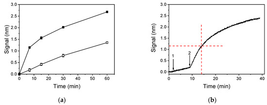 For reasons related to the ease of the proposed assay application to routine analysis, it would be preferable that the determination is completed in one step, i.e., by monitoring the primary immunoreaction of the anti-DON mAb between DON in the sample and that immobilized onto the chip surface. However, as depicted in Figure 4a, the primary immunoreaction duration should be extended to 60 min in order to receive a signal equal to or higher than 1 nm. On the other hand, when a secondary immunoreaction step was introduced, i.e., further reaction with an anti-mouse IgG antibody, the same signal level was obtained for the shortest primary immunoreaction duration tested (i.e., 7 min) after only 5-min reaction with the secondary antibody. Despite the fact that, as shown in Figure 4b, the reaction with secondary antibody does not reach maximum plateau values even after 30 min, almost 50% of the signal obtained in 30 min is acquired within the 5 first min. Thus, for the final assay protocol of WLRS DON determination, a 7-min primary immunoreaction followed by 5-min reaction with the anti-rabbit IgG antibody solution was selected.
