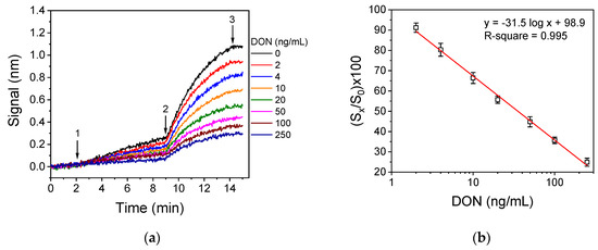(a) Real-time responses obtained for DON calibrators with concentration 0–250 ng/mL. The solutions which were flowed over the chips were as follows: assay buffer (start to arrow 1; 2 min), 1:1 (v/v) calibrator/anti-DON mAb mixture (arrow 1 to 2; 7 min), anti-mouse IgG antibody (arrow 2 to 3; 5 min), and assay buffer (arrow 3 to end; 1 min). (b) Typical linearized DON calibration curve (Equation (2)) obtained with calibrators prepared in buffer. The linear regression equation and the coefficient of correlation values are provided in the figure. Each point is the mean value of 3 measurements ± SD.
