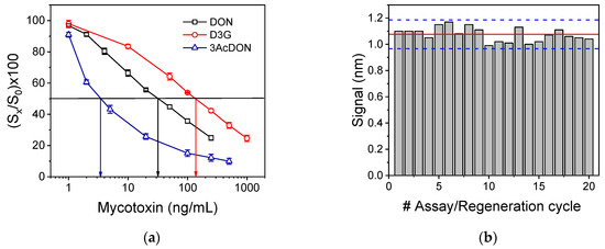 Prior to application of the immunosensor developed for analysis of grain samples, the cross reactivity of the antibody implemented in the assay towards the major plant DON metabolite, 3-DON-glycoside (D3G), and a DON-derivative also produced by Fusarium species, 3-acetyl-DON (3AcDON), was determined. The calibration curves obtained with D3G and 3AcDON calibrators in chips coated with DON-OVA as well as the respective DON calibration curve are presented in Figure 6a. The percent cross-reactivity (%CR) was determined by applying the equation: