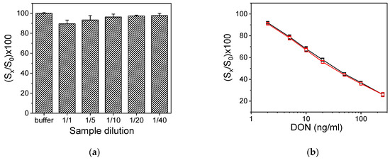 (a) Effect of maize water extract dilution with assay buffer to zero calibrator signal values with respect to zero calibrator value in buffer. (b) DON calibration curves received with calibrators prepared in assay buffer (black squares) or in maize water extract diluted ten times with assay buffer (red squares). Each point is the mean value of 3 measurements ± SD.