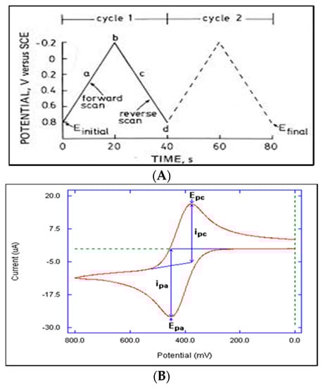 Cyclic voltammogram showing: (A) Potential against time (Reprinted with permission from [89]) (B) Current against potential. (Adapted from bioanalytical systems incorporated).