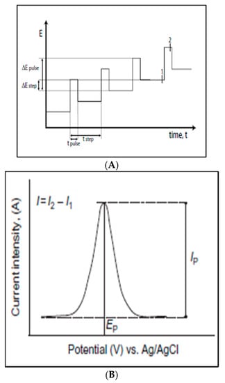 Differential pulse voltammetry showing (A) Potential against time; and (B) Current against potential (Adapted from [104] copyright Elsevier, 2017).