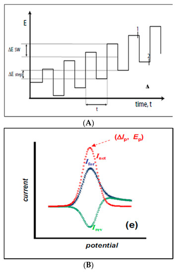 Square wave voltammetry showing (A) potential against time and (B) current against potential (Adapted from [104] copyright Elsevier, 2017).