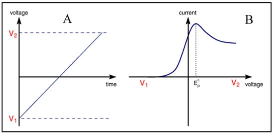 Linear sweep voltammetry showing (A) potential scan with time and (B) the voltammogram (Adapted from [109]).